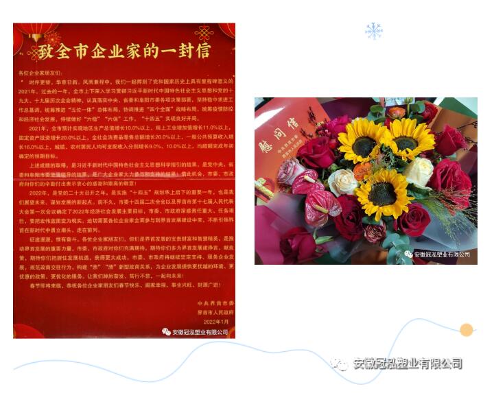 首先刘市长代表中共界首市委、界首市人民政府送来鲜花、慰问信和新春祝福。刘市长与公司董事长申乾成、总经理申辉深入交谈,了解过去一年企业生产经营情况及取得的丰硕成果,并对企业税收做出的贡献予以肯定,畅谈2022年的发展目标和工作思路,鼓励企业在新的一年里要继续踔厉奋发、笃行不怠,充分利用资本市场加快发展,把企业做大做强,努力开创我市企业上市融资工作的新局面。