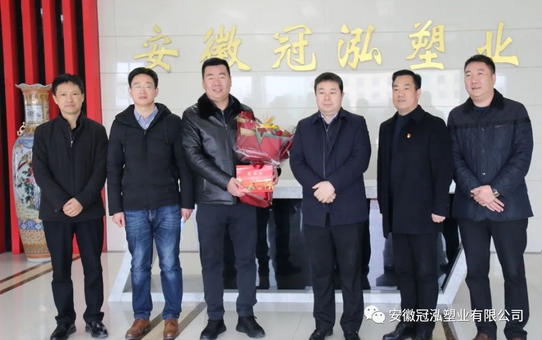 新春来临之迹,2022年1月21日上午,界首市委常委、常务副市长刘永春到安徽冠泓塑业有限公司新春慰问,光武镇党委书记戴海波,光武科技园管委会主任胡坤陪同。
