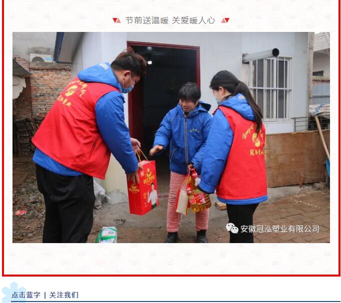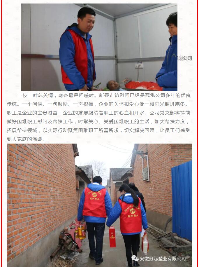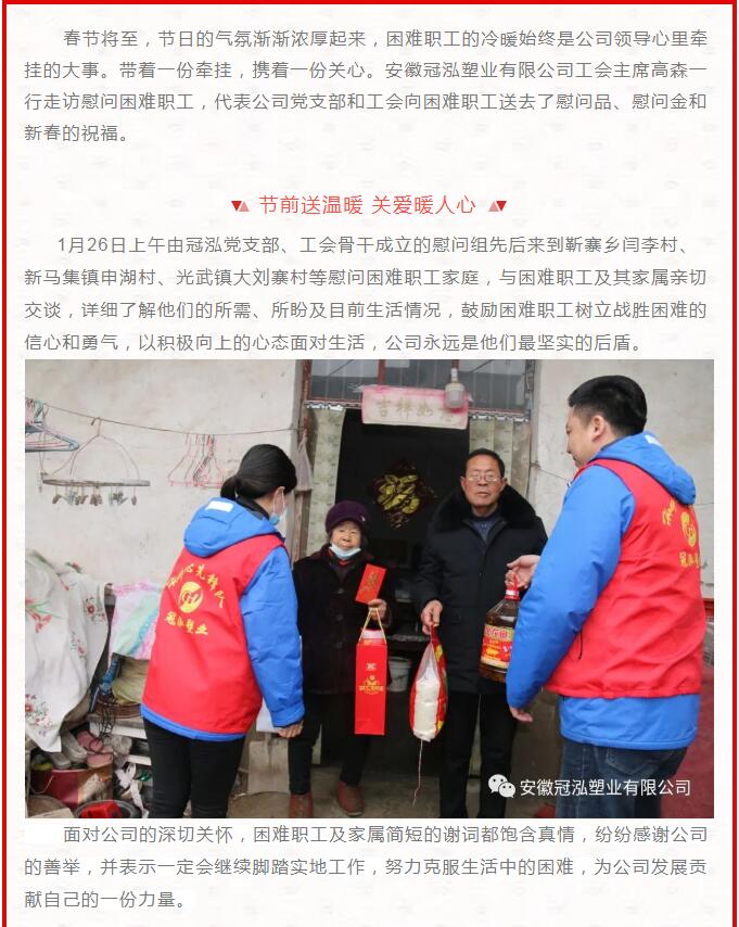 春节将至,节日的气氛渐渐浓厚起来,困难职工的冷暖始终是公司领导心里牵挂的大事。带着一份牵挂,携着一份关心。安徽冠泓塑业有限公司工会主席高森一行走访慰问困难职工,代表公司党支部和工会向困难职工送去了慰问品、慰问金和新春的祝福。