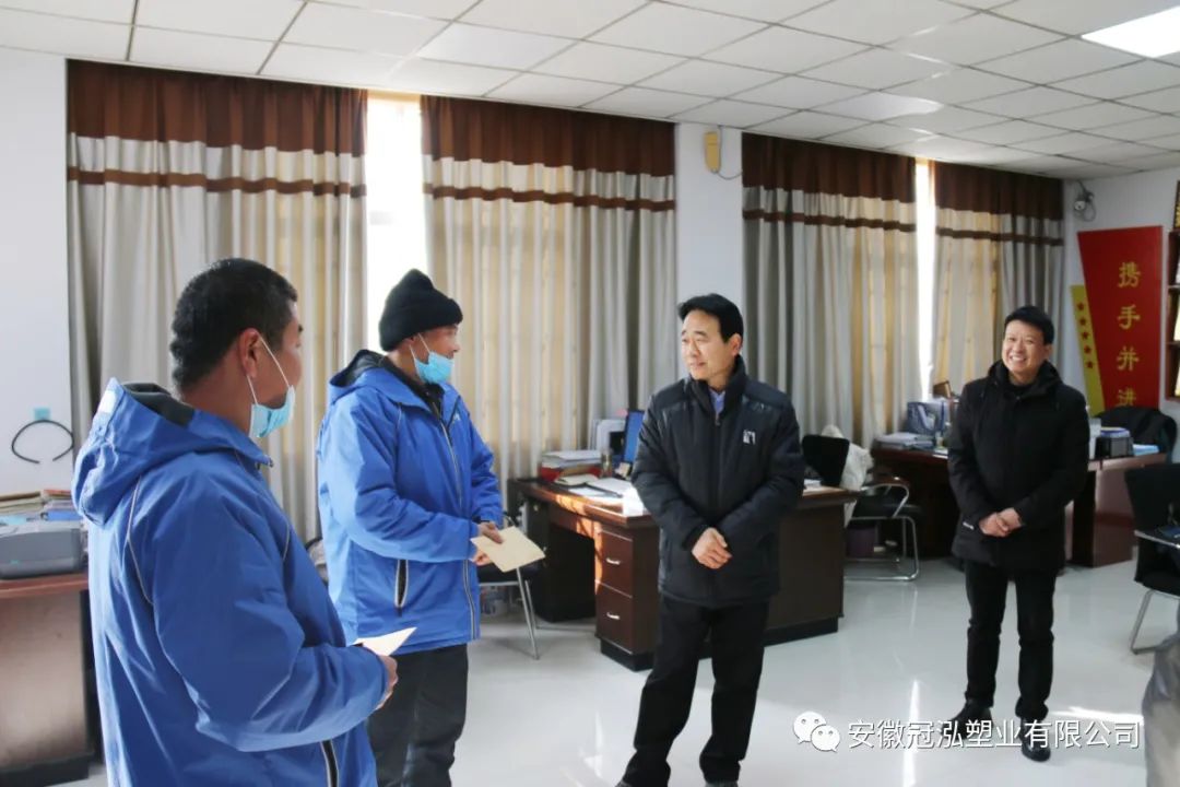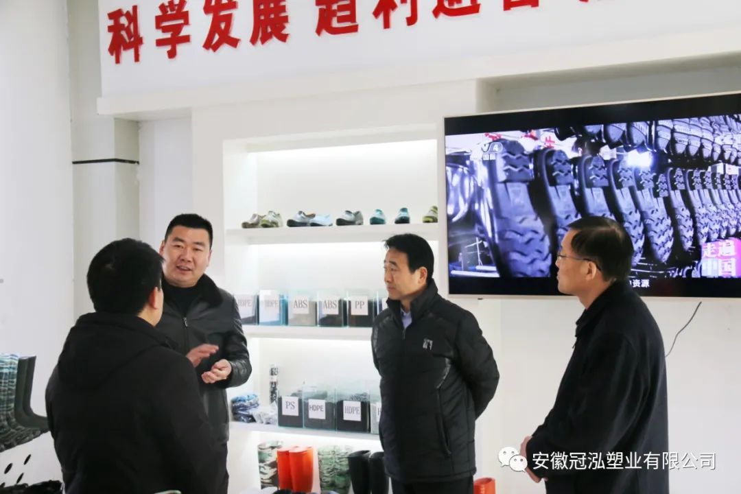 2022年元月13日上午,阜阳市委党校(阜阳行政学院)常务副校长朱洪亮、副校长訾东青一行莅临安徽冠泓塑业有限公司开展“四送一服双联”走访调研,界首市经信局副局长聂奎陪同调研。朱洪亮校长一行实地查看企业生产经营情况,与公司董事长申乾成深入交流,分析研究企业遇到的问题和困难,宣贯了阜阳优化营商环境的相关政策,并对公司近年来稳步发展表示充分肯定。